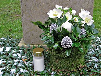 In der Adventszeit dekorieren viele Angehörige die Gräber Ihrer Lieben. So wie im eigenen Haus oder Garten finden sich immer öfter Christbaumkugeln, Zapfen oder kleine, geschmückte Tannenbäume auf dem Friedhof wieder. Sehr dekorativ und zeitgemäß sind Christrosen. Diese wunderschöne Pflanze blüht in einer Jahreszeit, in der die Natur kaum eine Blüte hervorbringt. Mit einer passenden Dekoration und einer Kerze hält so die weihnachtliche Stimmung auch auf den Friedhof Einzug. Im neuen Jahr kann die die Christrose an einem leicht schattigen Standort ausgepflanzt werden und Ihnen so noch viele Jahre zur Weihnachtszeit Freude bereiten.