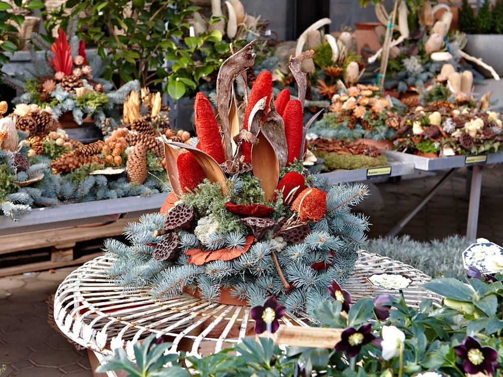 Leichte und hohe Gestecke kann man ganz einfach mit einem kleinen Stab sichern: Der wird durch das Gesteck hindurch in die Erde gebohrt, von Pflanzen und Grün verborgen, und sorgt doch für sicheren Halt. Auch Topfpflanzen auf windigen Friedhöfen kann man mit diesem kleinen Trick sichern. Dabei wird der Stab einfach durch das Abzugsloch des Topfes gesteckt.