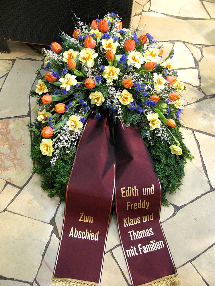 Einfühlsam und kompetent beraten wir Sie bei der Umsetzung von Sargschmuck, Kränzen und Trauergestecken. Gerne gehen wir dabei auch auf die einzelnen Bedeutungen der Pflanzen ein.